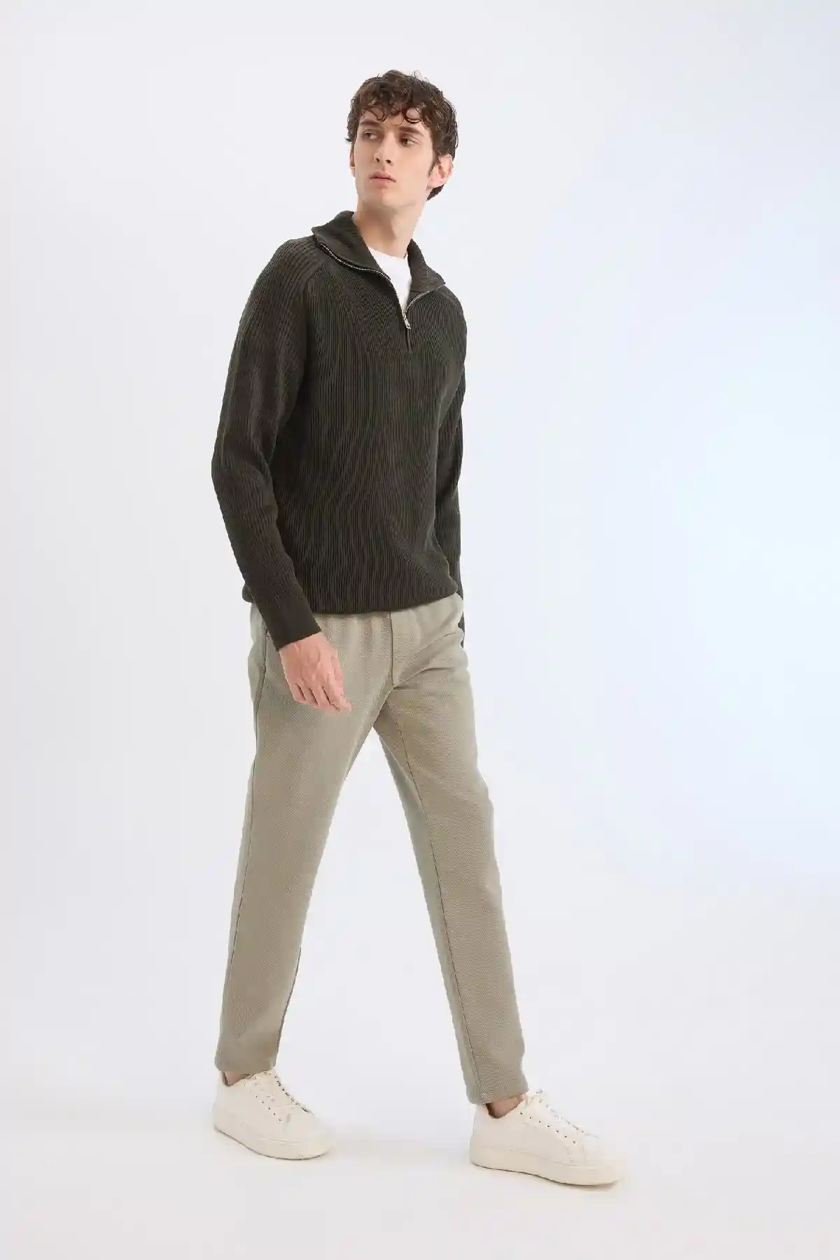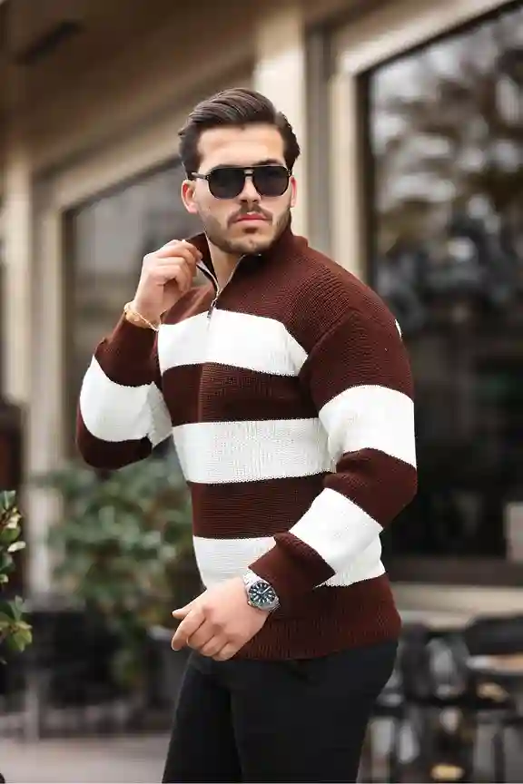 Çizgili Selanik Örgülü Yarım Fermuar Triko Erkek Kazak